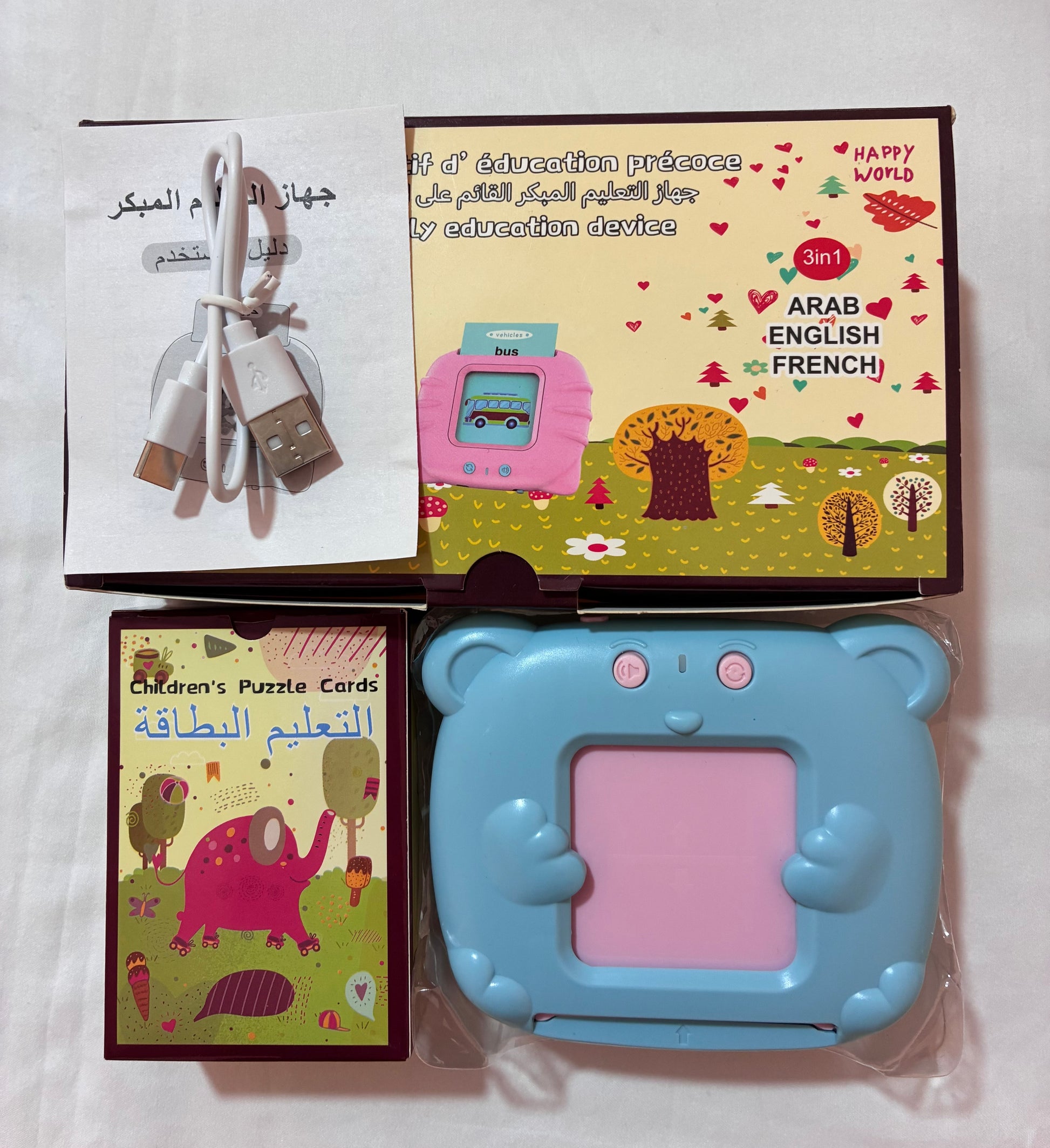 ✅ بطاقات تعليمية ناطقة: علم ابنك أسماء الأكل، الحيوانات، وسائل النقل… بثلاث لغات.